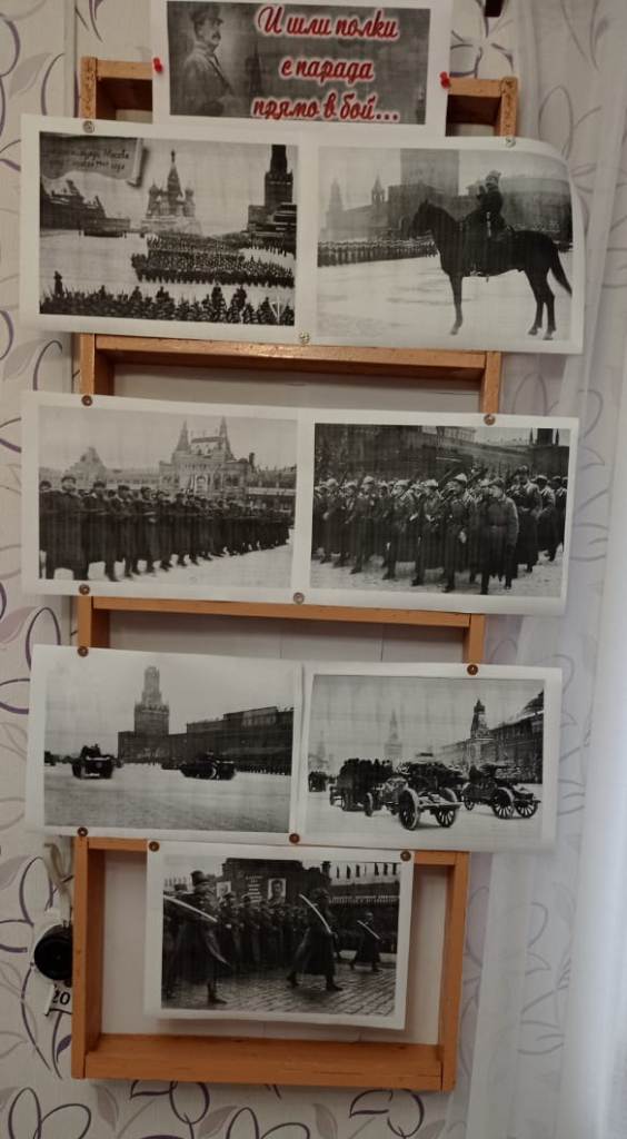 Библиотекарь рассказала ребятам о военном параде 7 ноября 1941 года - параде в честь 24-й годовщины Октябрьской революции, проходившем на Красной площади в Москве во время Великой Отечественной войны. С большим интересом слушали рассказ о том, что мероприятие готовилось в обстановке строжайшей секретности и проводилось в разгар битвы за Москву, какую важную роль сыграл парад для хода Великой Отечественной войны. Затем ребята посмотрели видео - ролик с документальными кадрами парада 1941 года. Мероприятие позволило погрузиться в историю и ощутить гордость за страну и народ, который объединился перед лицом суровых испытаний. Для ребят была подготовлена  тематическая фотовыставка «И шли полки с парада прямо в бой».