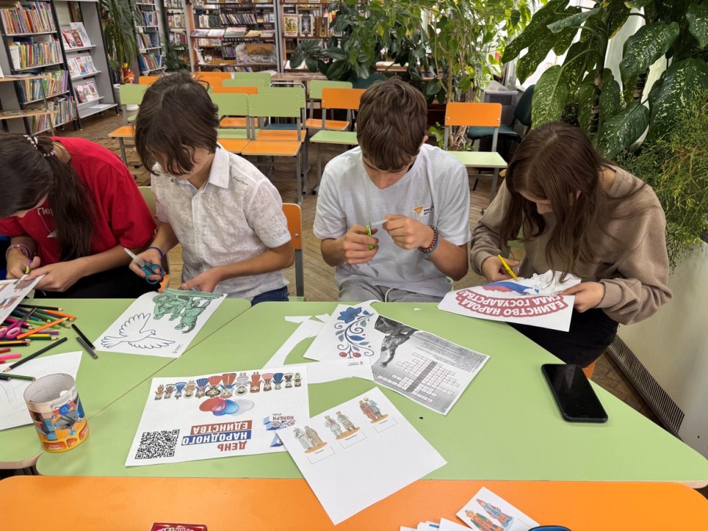 В завершение  участники мероприятия с удовольствием приняли участие в создании тематической выставки, на которой были представлены книги об обычаях и традициях, сказки народов России, энциклопедии по истории нашего государства, а так же карта, которые ребята с большим интересом собирали и рассматривали.