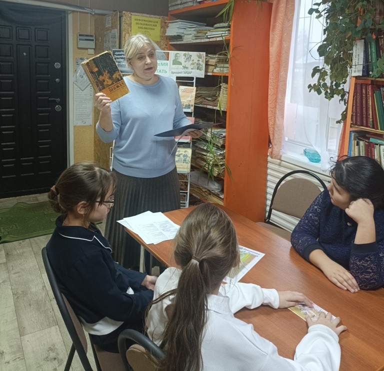 Четвероклассники и пятиклассники Первомайской средней школы узнали о жизни писателя, его автобиографических чертах в образе главного героя Бориса Горикова и о том, как повесть стала символом мужества и идеалов. После рассказа школьники ответили на вопросы викторины и ознакомились с книжной выставкой «Время читать Гайдара».